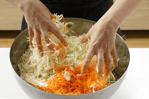 Соединить морковь и капусту в подходящей посуде и тщательно размять руками, одновременно перемешивая.