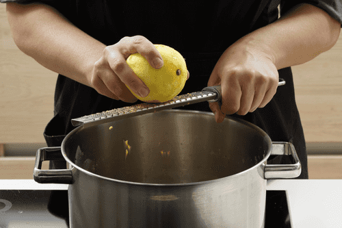 Натереть на мелкой терке цедру 1 лимона, не задевая белой части: она горчит.