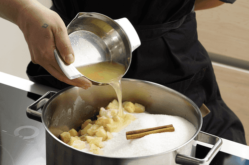 Добавить сахар, палочку корицы и лимонный сок в таз.