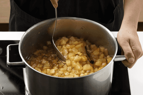 Положить яблоки с цедрой в таз, в котором варились шкурки.