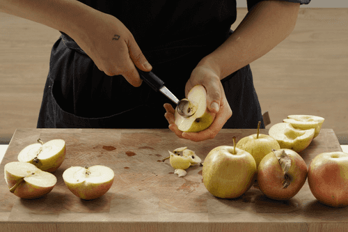 Яблоки разрезать пополам, сердцевину удалить, затем нарезать четвертинками.