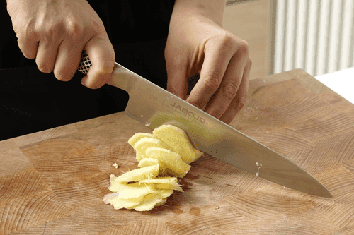 Имбирь очистить от кожицы и тонко нарезать.