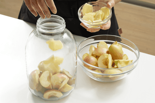 Разложить в стерилизованные банки яблоки и имбирь.