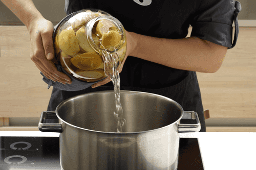 Снова перелить сироп в кастрюлю, довести до кипения.