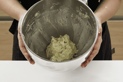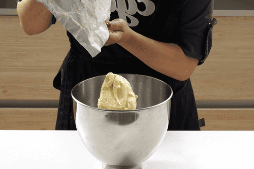 Посолить по вкусу и перемешать до однородной консистенции. Убрать дежу в холодильник на 10–15 минут.