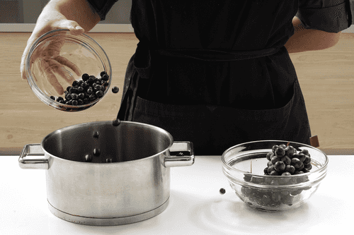Ягоды промыть, обсушить, с веточек можно не снимать. Выложить в сотейник.