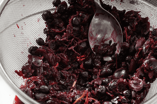 Массу остудить и протереть через сито или дуршлаг с мелкими ячейками. Если черноплодка суховата и масса плохо протирается, можно отжать остатки через марлю.