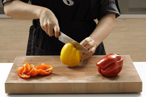 У перца удалить семена и плодоножку, нарезать перец широкими клиньями.
