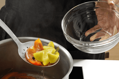 Выловить перец шумовкой и переложить в стерилизованные банки.