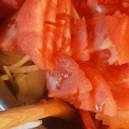 Очистить помидоры от кожицы и нарезать тонкими четвертькольцами.