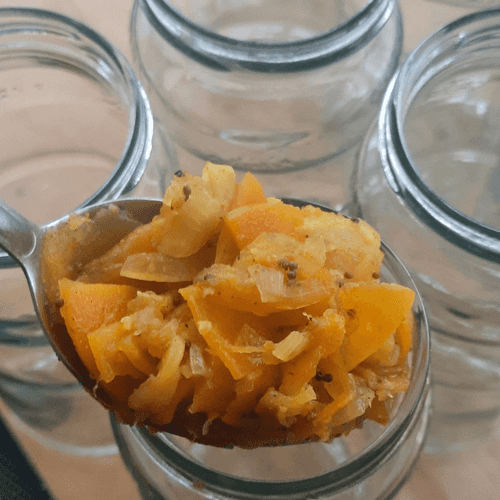 Простерилизовать банки и крышки (поместить в холодную духовку, нагреть до 100 градусов и подержать 10–15 минут), затем разложить готовые горячие чатни по банкам, закрыть крышками, завернуть в одеяло и оставить остыть на несколько часов (или на ночь).