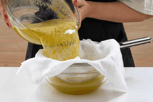 Процедить сок через несколько слоев марли. На данном этапе можно попробовать сок и решить, нужно ли добавить к нему сахар, или он и так достаточно сладкий.