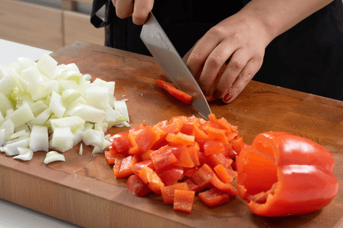 Лук очистить от кожуры. Болгарский перец избавить от семян и плодоножки. Нарезать лук и перец кубиком со стороной 2 см.
