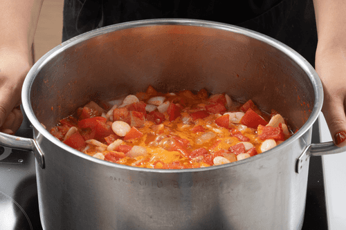Довести смесь до кипения и тушить под крышкой на слабом огне до готовности фасоли.