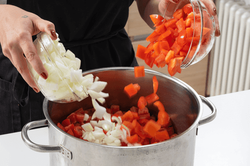 Сложить нарезанные овощи в кастрюлю.