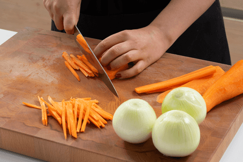 Лук и морковь очистить. Лук нарезать полукольцами, морковь — соломкой.