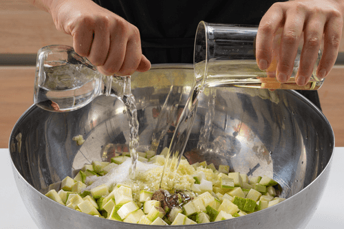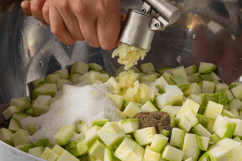 К кабачкам добавить чеснок, пропущенный через пресс. Добавить соль, сахар и перец.
