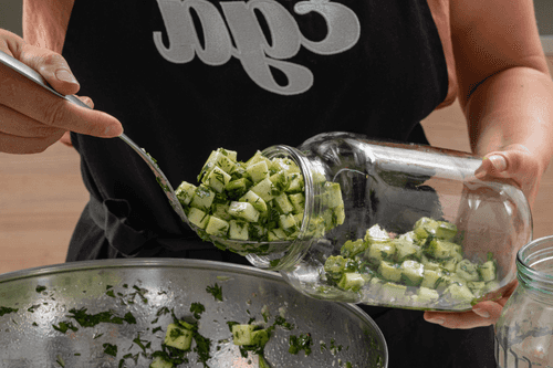 Добавить к кабачкам зелень и переложить в банки и накрыть крышками, не закручивать.
