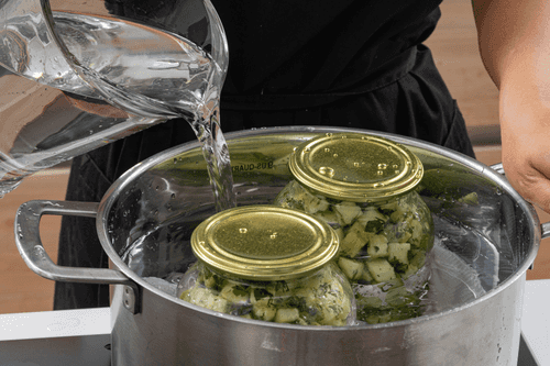 На дно большой кастрюли выложить кухонное полотенце, на него поставить банки и влить воду так, чтобы она была банкам по плечики.