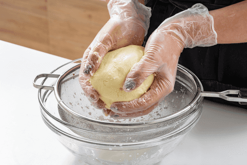 Собрать все масло в ком и переложить на сито.