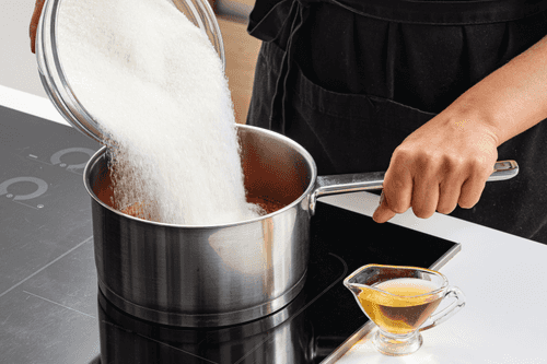 Добавить сахар и уксус, поставить на сильный огонь.