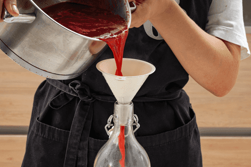Перелить в стерилизованные бутылки или банки с помощью воронки.