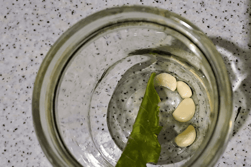 Через 20 минут воду из банки слить в кастрюлю, добавить 1 столовую ложку сахара и 2 столовые ложки соли, хорошо размешать. Кипятить этот рассол 5 минут, а затем залить в банку, оставив немного места для уксуса.
