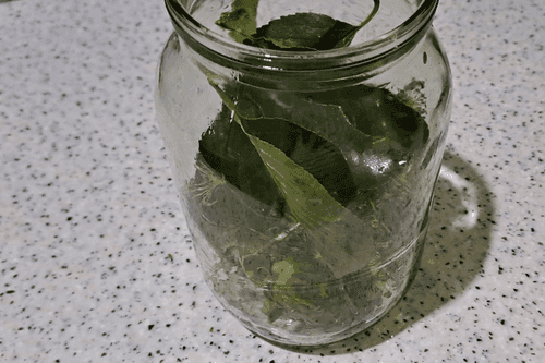 Выложить на дно банки листья вишни и часть соцветий укропа.
