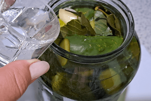 Влить в банку с огурцами 100 мл уксуса 9%.