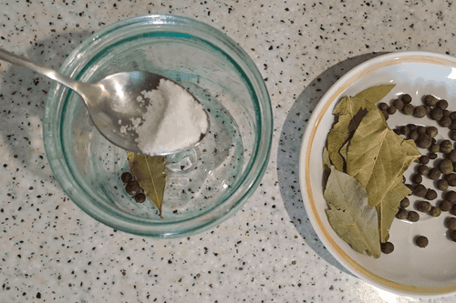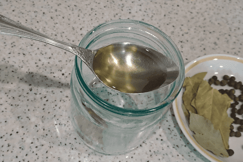 На дно чистой и сухой банки выложить 3 горошины душистого перца, 0,5 лаврового листа и 0,5 чайной ложки соли.