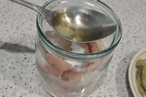 Заполнить банку до половины заранее подготовленной рыбой и снова выложить все специи: 2 горошины душистого перца, 0,5 лаврового листа и 0,5 чайной ложки соли и 1 столовую ложку растительного масла.