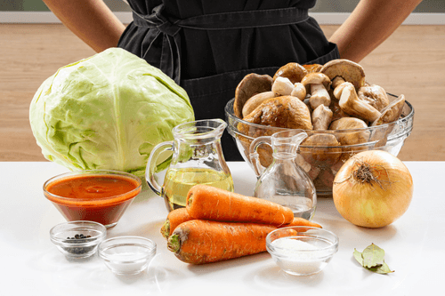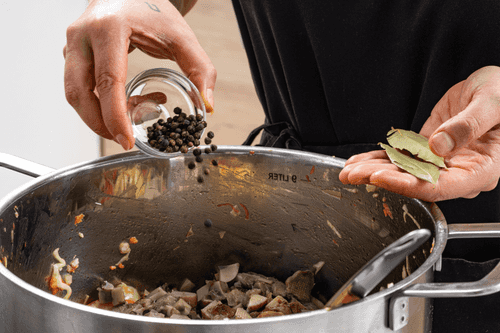Через 30 минут добавить грибы, перец горошком, лавровый лист и тушить еще 40 минут. Готовность определить по капусте – она должна стать мягкой.