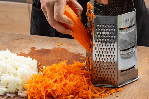 Лук нарезать кубиками. Морковь натереть на крупной терке.