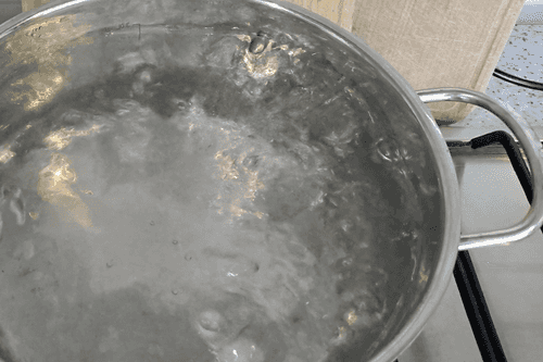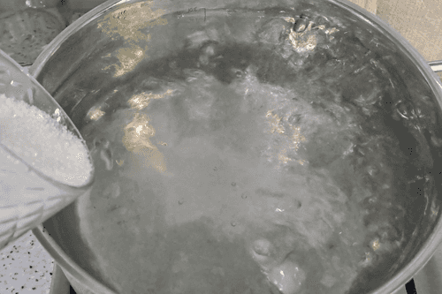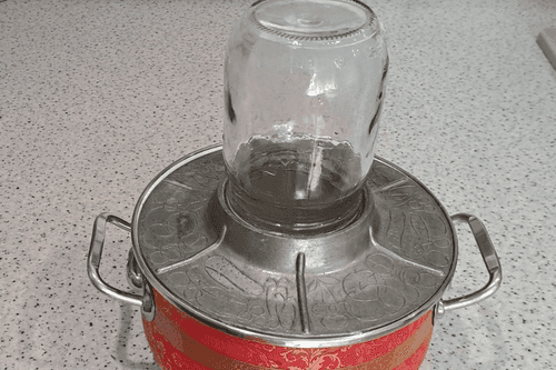 Вылить воду из банки обратно в кастрюлю. Добавить еще дополнительно 50 мл воды из расчета на банку объемом 0,5 литра. Довести до кипения.