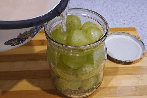 Накрыть банку с виноградом железой крышкой, но не закатывать и оставить примерно на 20 минут.