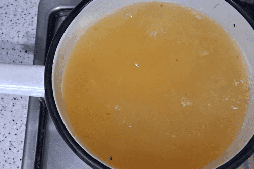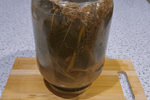 Когда огурцы перестали активно бродить и изменились в цвете (примерно через 3 дня), слить рассол из банки в кастрюлю.