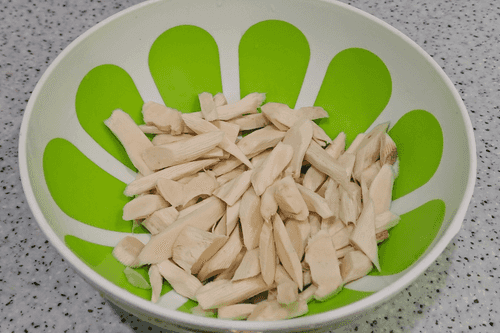 Нарезать кусками, чтобы пропустить через мясорубку.