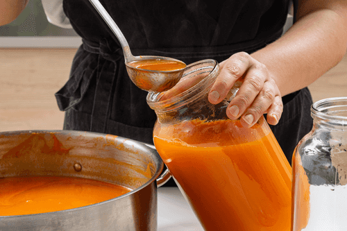Разлить сок по банкам и закатать стерилизованными крышками.