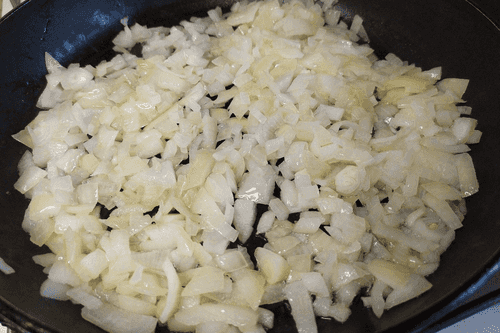 Обжарить лук на растительном масле 3–4 минуты.