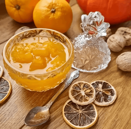 Тыквенное варенье с апельсином — это яркое, согревающее лакомство, которое вобрало в себя всю солнечную сладость тыквы и освежающую кислинку цитрусовых. Этот рецепт уходит корнями в русскую кухню, где варенье ценится не только за вкус, но и за целебные свойства. Бадьян придаёт пряные нотки, создавая гармонию с карамелизированной тыквой. Варенье получается густым, ароматным, с лёгкими цитрусовыми оттенками, а его бархатистая текстура делает его идеальным дополнением к утреннему чаю, тостам или выпечке. Оно не просто радует вкусом, но и согревает в холодные дни, даря уют и наслаждение каждой ложке.