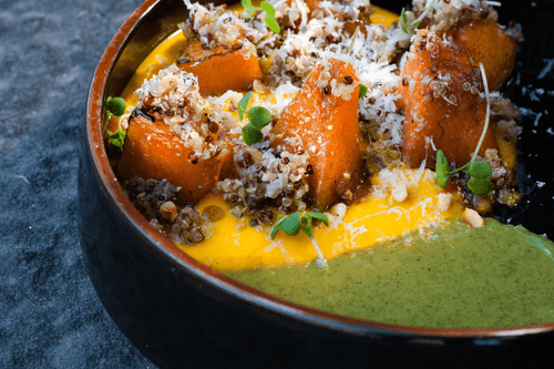 Распределяем тыквенный соус по тарелке, выкладываем заправленную тыкву, затем киноа. Добавляем тыквенные семечки, обжаренный фундук и натертый пармезан.