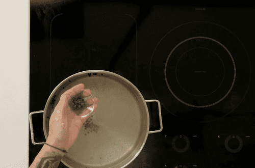 Добавить лавровый лист и перцы. Довести до кипения, затем снять с огня и дать остыть до 60 градусов.