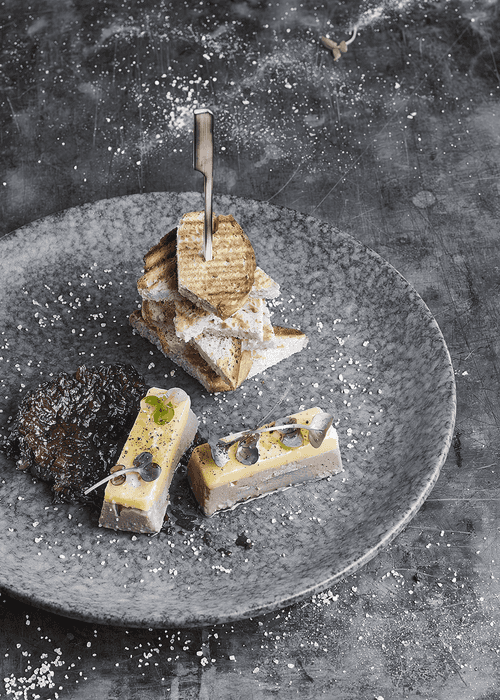 Хлеб подсушить и нарезать углами, скрепить шпажкой, рядом выложить мармелад из лука-шалот и готовый порционный паштет. Украсить кресс салатом, перцем черным свежемолотым и морской солью.