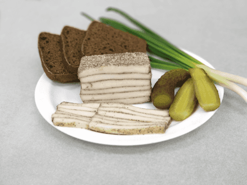 Взять брусок сала — 5 см в высоту, 5 см вширь и 10 см в длину. Можно с мясными прожилками, можно без них, не критично. Зачистить смоленую шкурку от гари. Положить сало на бок, так, чтобы шкурка была с левой стороны и резать вдоль шкуры на пять частей, чтобы получились длинные слайсы толщиной в сантиметр. Один кусок получится со шкурой.
