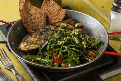 Стейк из баклажана — это изысканное блюдо авторской кухни, которое удивляет сочетанием простоты и глубины вкуса. Баклажан, нежный и сочный после жарки, приобретает восхитительный аромат, подчеркнутый оливковым маслом, солью и перцем. Дополненный свежими помидорами черри, пикантной рукколой и хрустящими кедровыми орехами, этот стейк становится настоящей гастрономической находкой. Подача со злаковым хлебом добавляет текстурную сложность и делает блюдо более сытным. Это блюдо — идеальный выбор для тех, кто ценит легкость и элегантность вкуса, а также хочет разнообразить свой рацион оригинальными вегетарианскими рецептами.