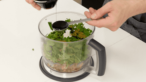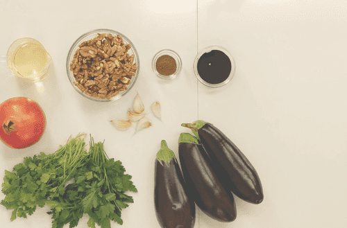 В блендере пробить грецкие орехи, мелко нарезанную зелень, хмели-сунели, соль, чеснок, 30 мл горячей воды и наршараб. Если масса получается слишком густой, добавить немного горячей воды.