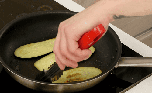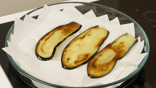 Обжарить баклажаны до золотистого цвета с обеих сторон, предварительно промакивая каждый бумажным полотенцем, чтобы избавиться от лишней влаги.