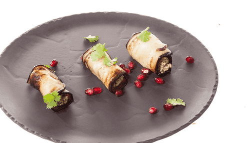 Готовые рулеты выложить на тарелку и посыпать зернами граната.