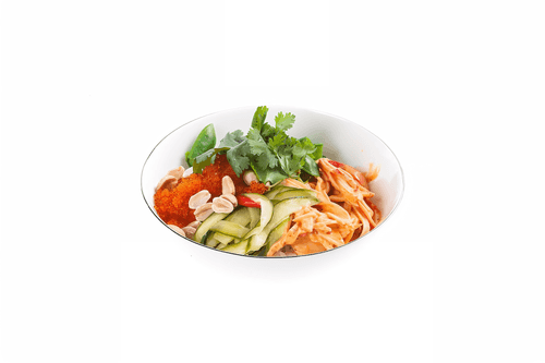 В тарелку выложить рис, сверху краб, горошек, битые огурцы, тобико, арахис и кинзу.