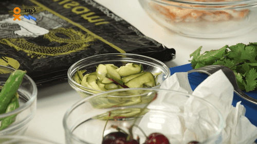 Огурцы разрезать вдоль пополам, отбить рукояткой ножа, нарезать тонкими полукольцами. Добавить к ним 10 мл рисового уксуса, 10 мл сока апельсина, 5 грамм сахара и измельченный перец чили.